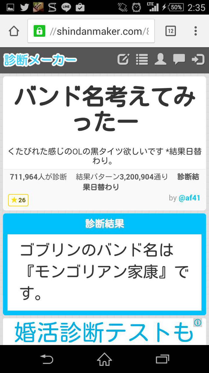 診断メーカー バンド名-オシャレバンド名ジェネレータ ありそうでないようなオサレバンド名を作成します UK US Indie ネオアコ 渋谷系 etc @sugarme_バンド名考えてみったー くたびれた感じのOLの黒タイツ欲しいです *結果日替わり。 @af41 2,406 37 バンド 音楽 つぶやき シェア 結果パターン ?